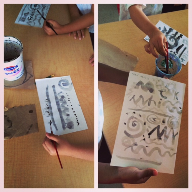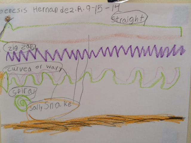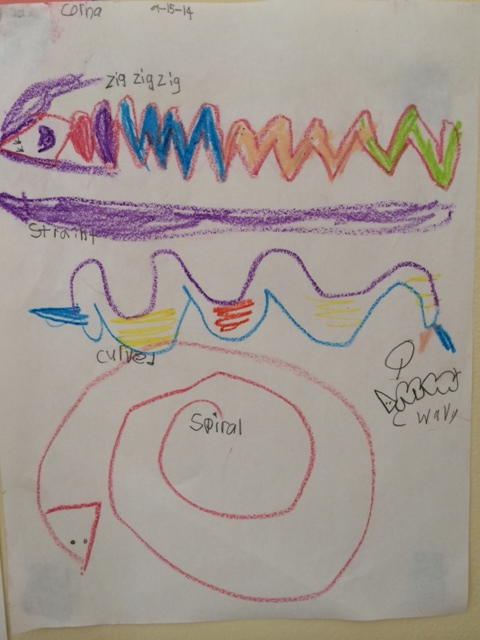 With my kindergarteners, we’ve been focusing on line and color. We started with the line sculptures in the previous post, and moved on to creating lines with colored pencils. Next we practiced painting lines using only one color, so students could get familiar with painting procedures.