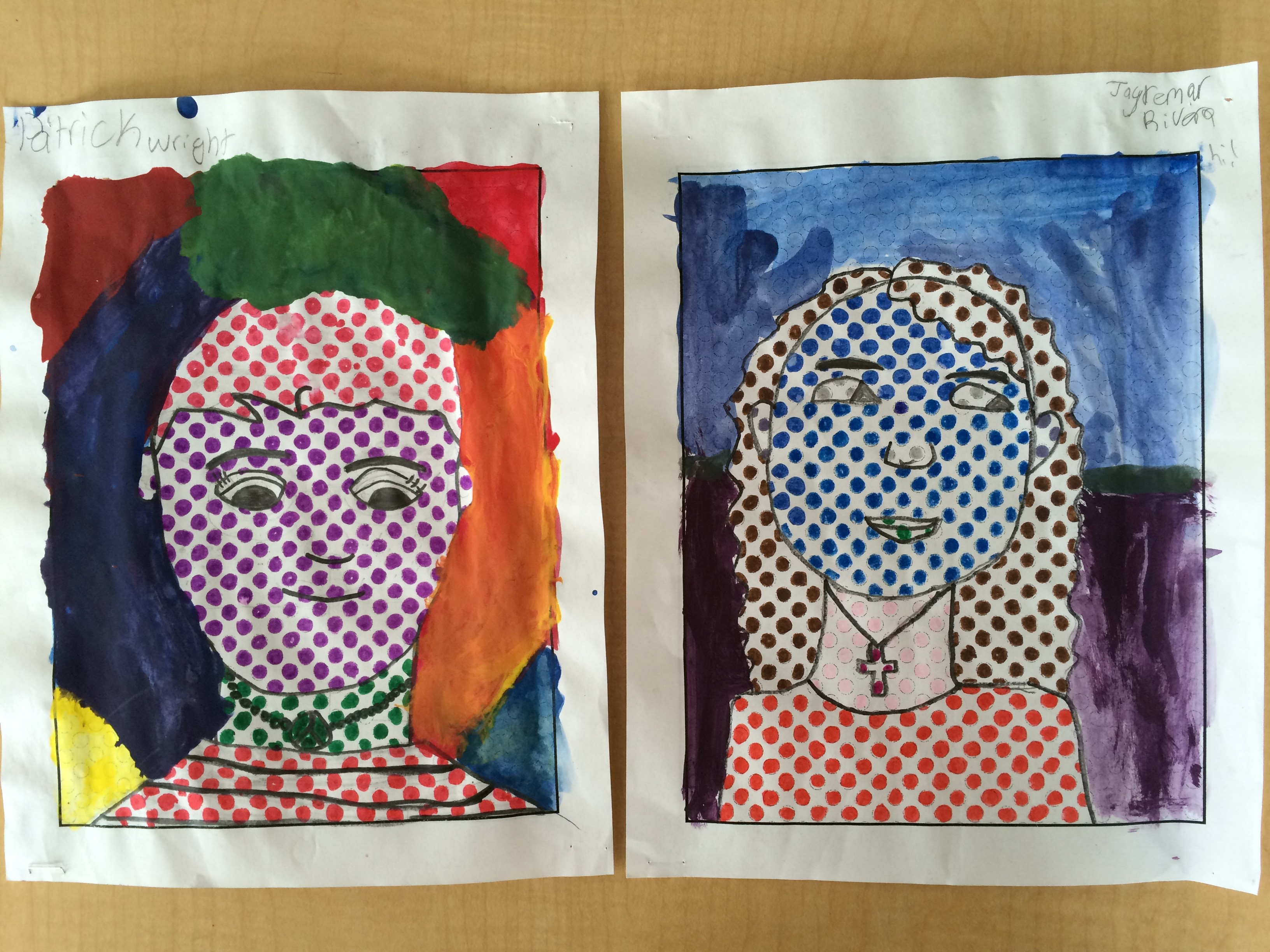 Fourth and fifth grades spent about four classes drawing their portrait on pre-dotted paper, adding color using colored pencils and paint and outlining in sharpie.