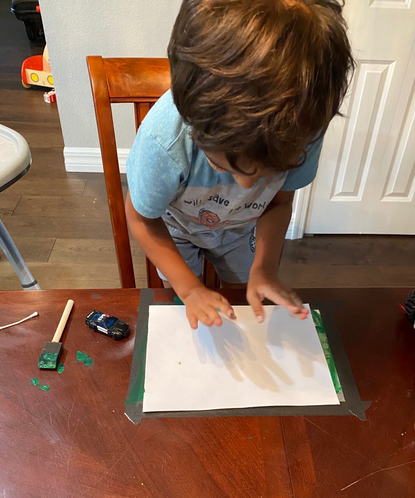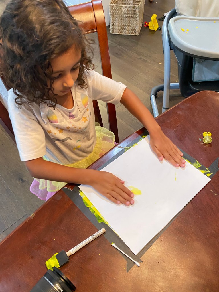 For my little ones, this was a process over product project. They liked the spreading of the paint and painting with a q-tip much better than the actual final print. So don’t stress over the results (and mess – thank you baby wipes)!
