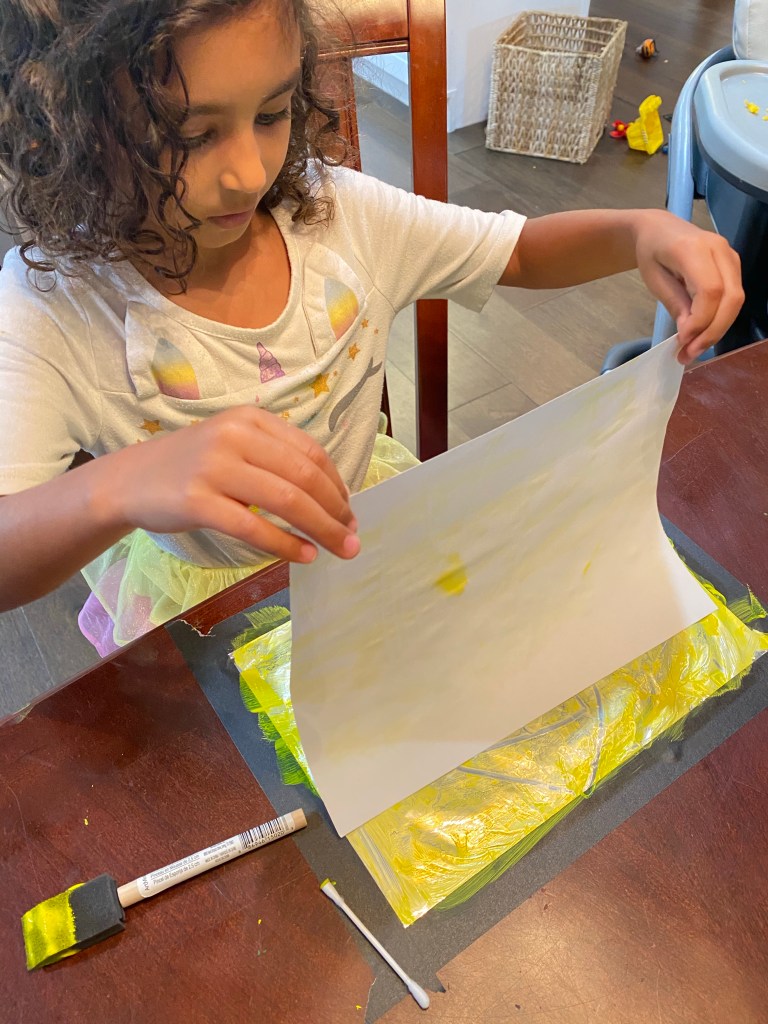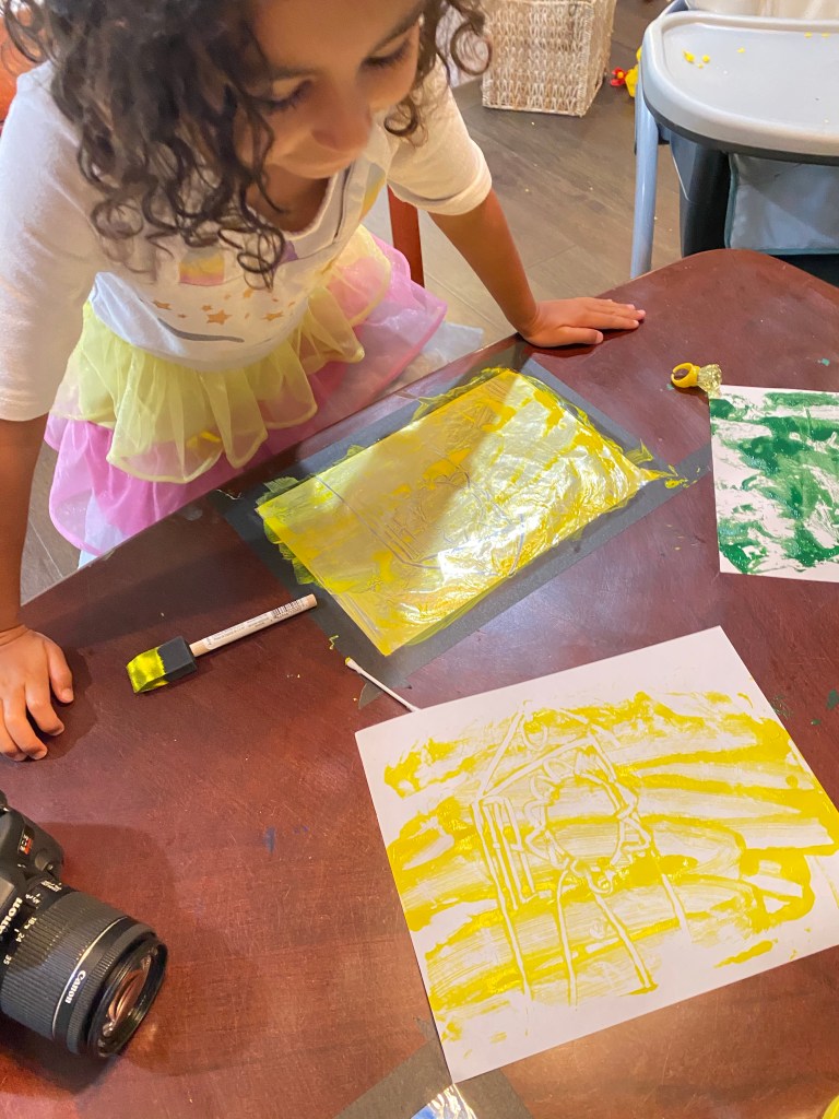 I did this monoprint activity in an hour with my three year old, five year old AND teenaged nephew in Boston via facetime. So it’s a great multi-age art project.