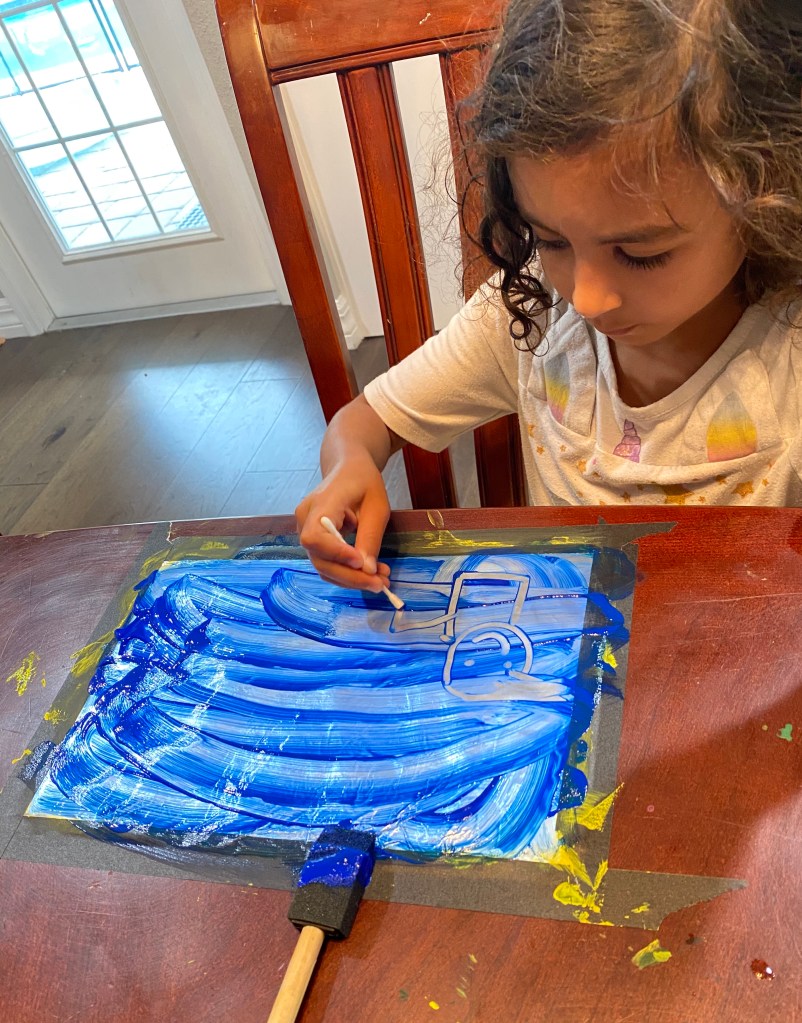 - Use the q-tip to draw a picture or design. Don’t forget letters have to be written backwards! Do this part relatively quickly so the paint doesn’t dry