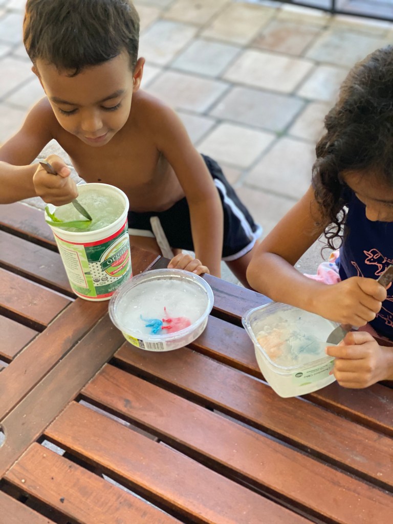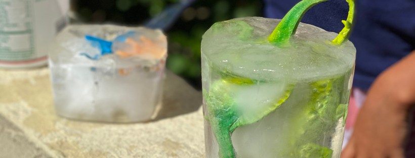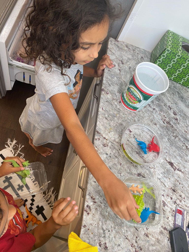 For this simple activity, we froze those pesky plastic dinosaurs in recycled containers.